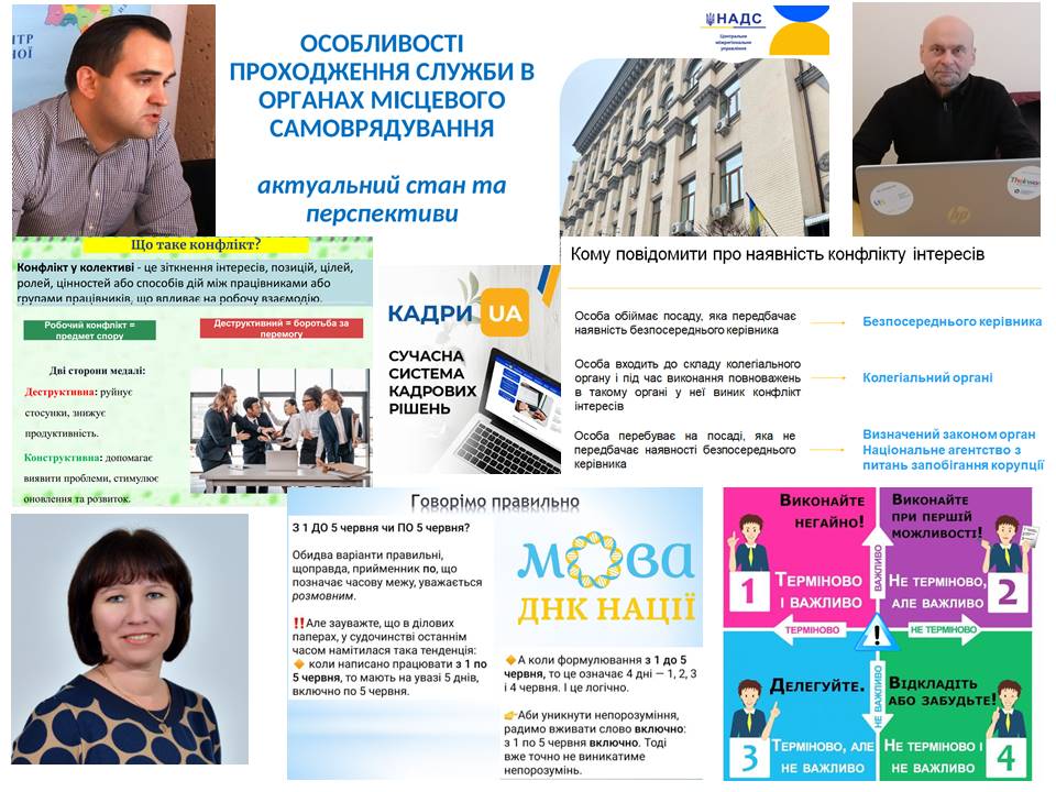 Кадровики також розглянули ключові етапи службової діяльності – від вступу на службу до професійного зростання та припинення службових відносин. Особливу увагу було приділено питанням дотримання законодавства, ведення кадрової документації, оцінювання результатів службової діяльності, а також правам і обов’язкам посадових осіб місцевого самоврядування.
